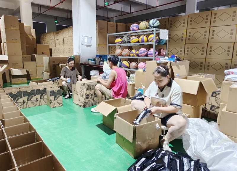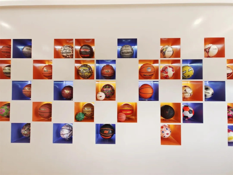 Nello showroom di prodotti di Meidong Sports, ci sono dozzine di prodotti da basket, calcio e pallavolo di diversi stili e colori vivaci.
